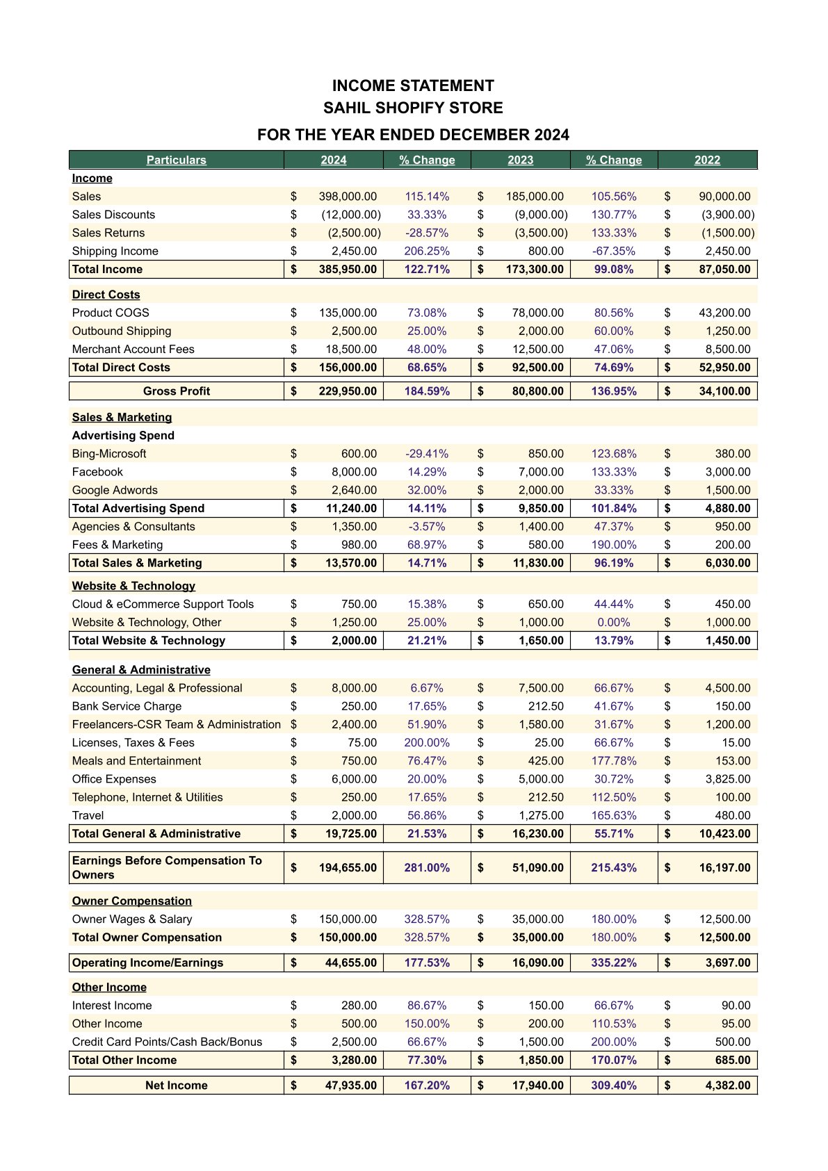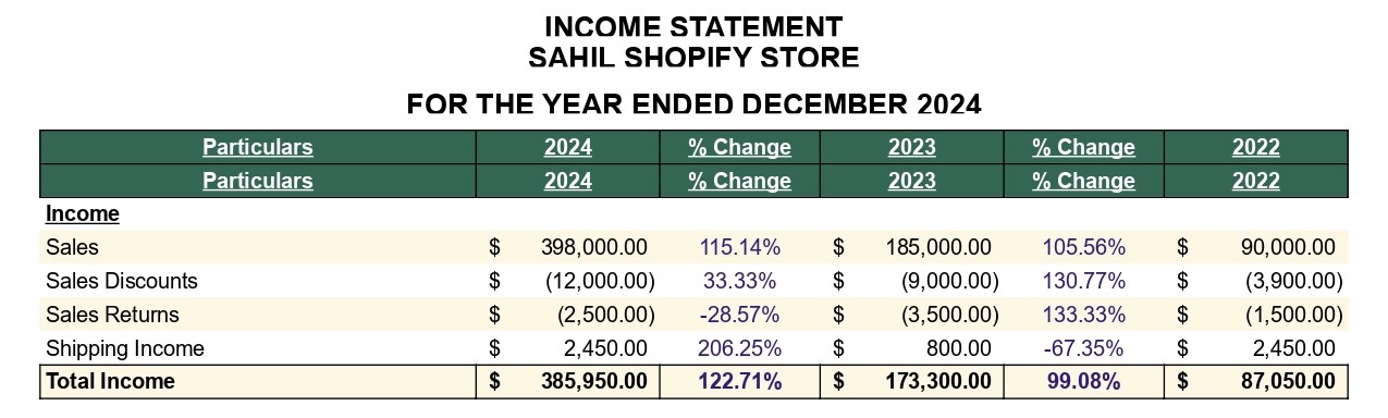 Before diving into specific strategies, here's a full view of the income statement we’ll be working with — pulled from a real e-commerce store scaling from $90K in sales (2022) to nearly $400K (2024).