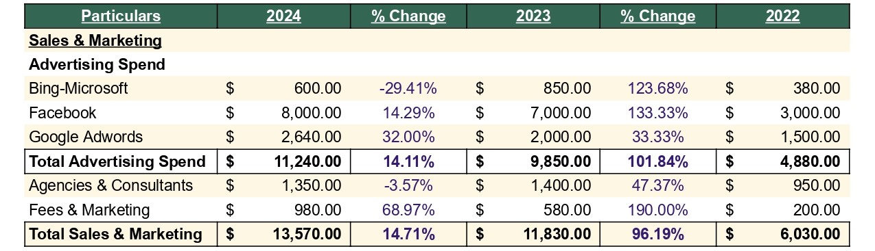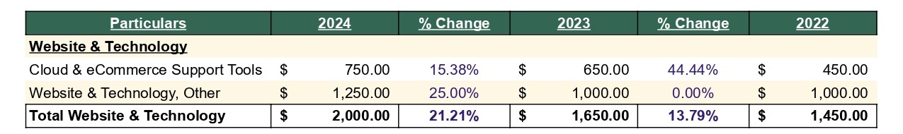 Website & Technology (Other): 2022 → $1,000 → 2023 → $1,000 (0%) → 2024 → $1,250 (+25%)