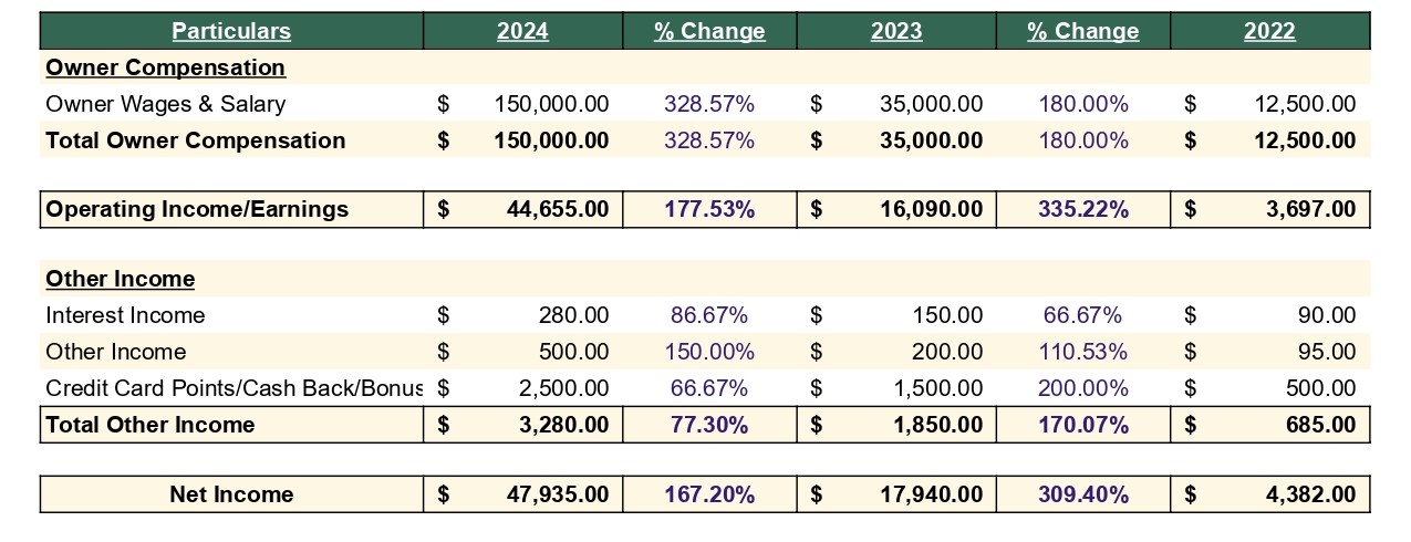 2024: Major salary increase—The owner starts taking structured pay as the business stabilizes.